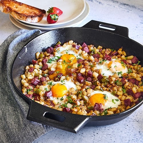Dank der hohen Wärmespeicherung reicht meist eine mittlere Hitzeeinstellung aus. Die Pfanne kann auf dem Herd gestartet und anschließend direkt im Ofen fertig gegart werden – ohne Umfüllen.
